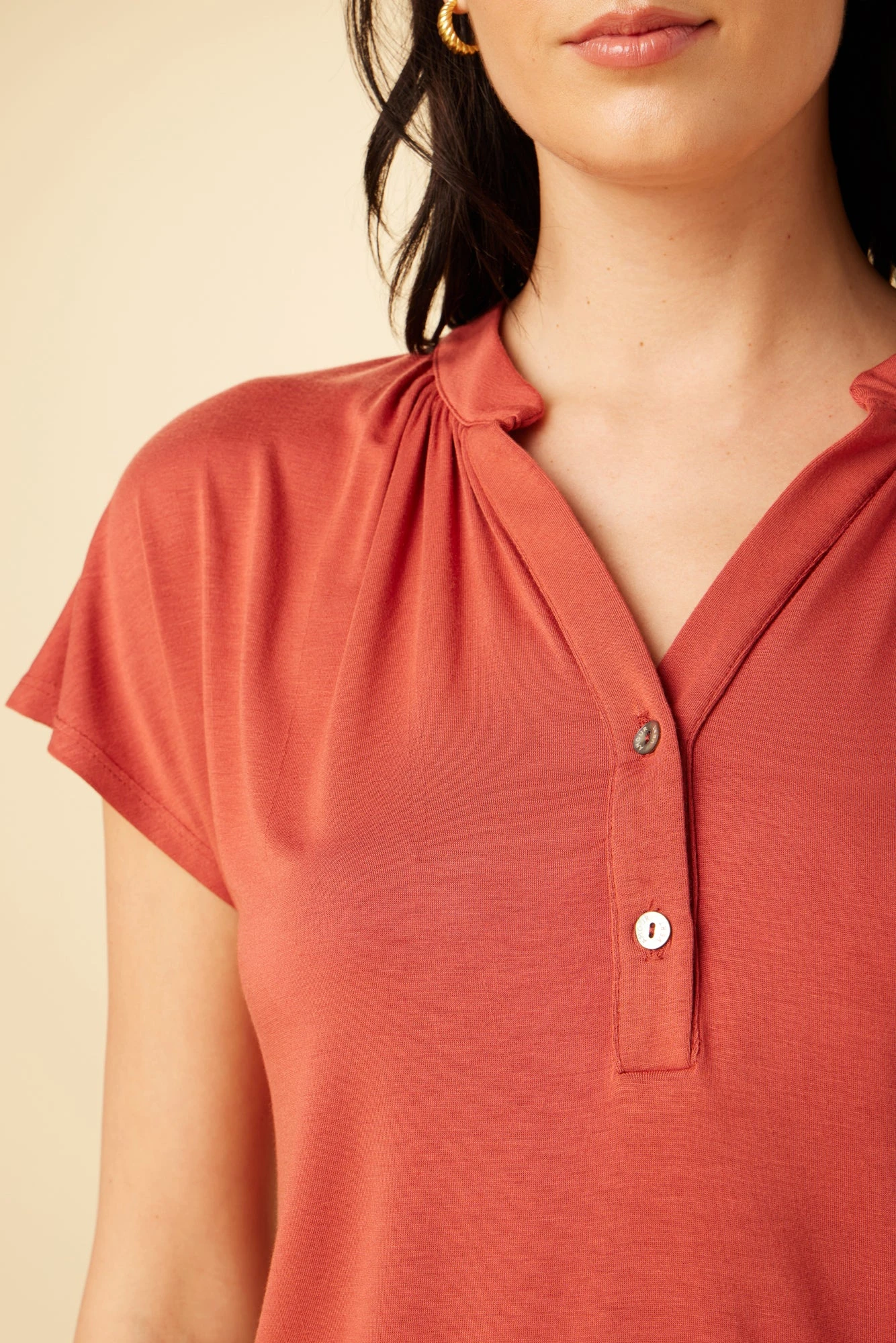 This style features our signature soft tailoring details with a v-neck opening, two-button closure, short sleeves, and an overall relaxed fit. We recommend pairing with mid-rise bottoms.Â
