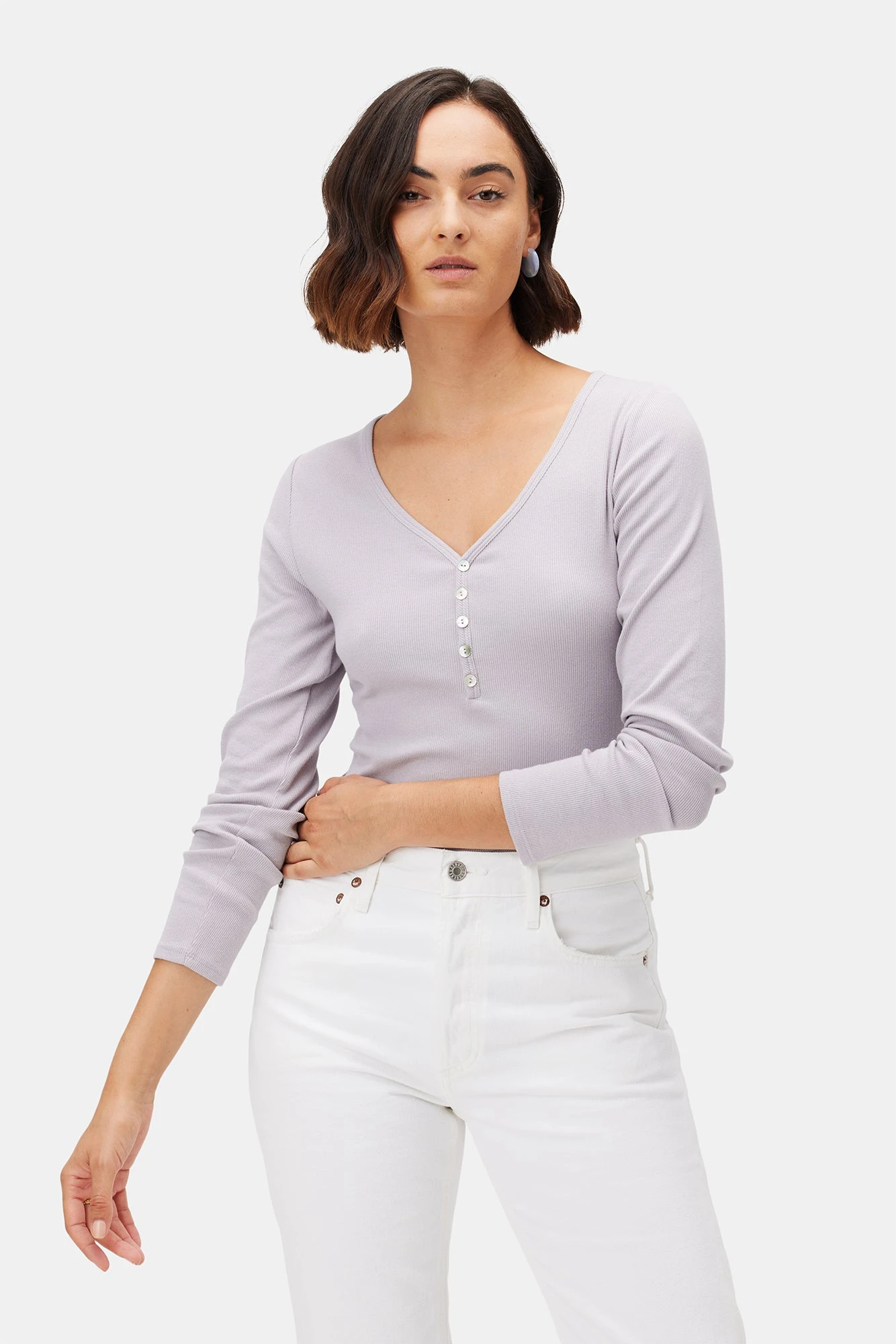 - Long sleeve top featuring v-neck top with henley detail at front.Â