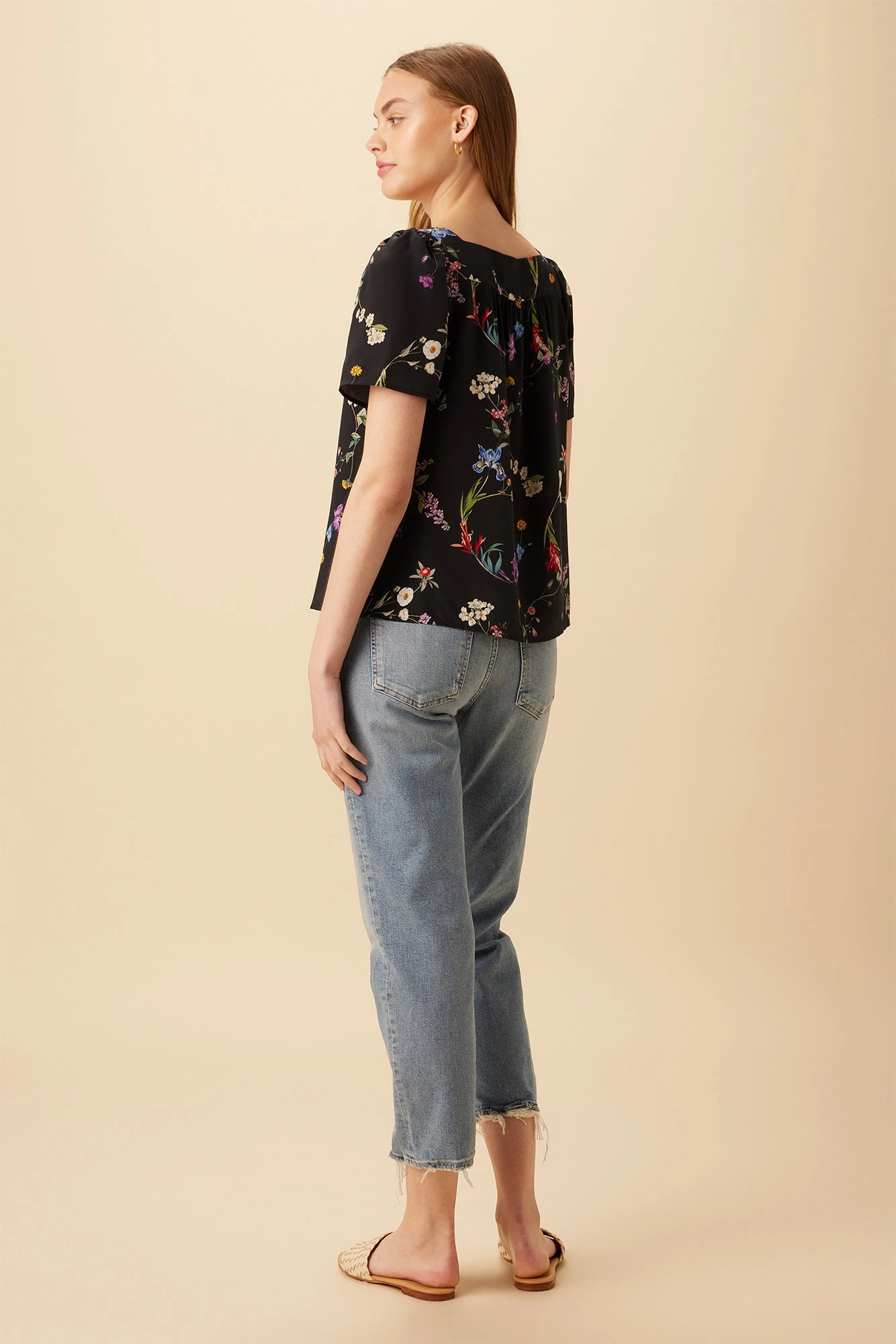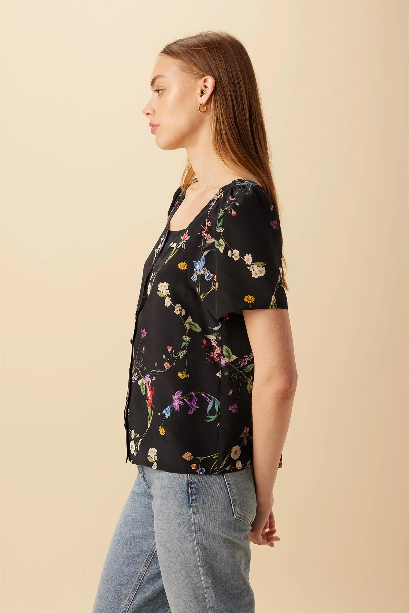 - Short sleeve washable silk blouse featuring front placket with buttons, square neck line, and straight hem.