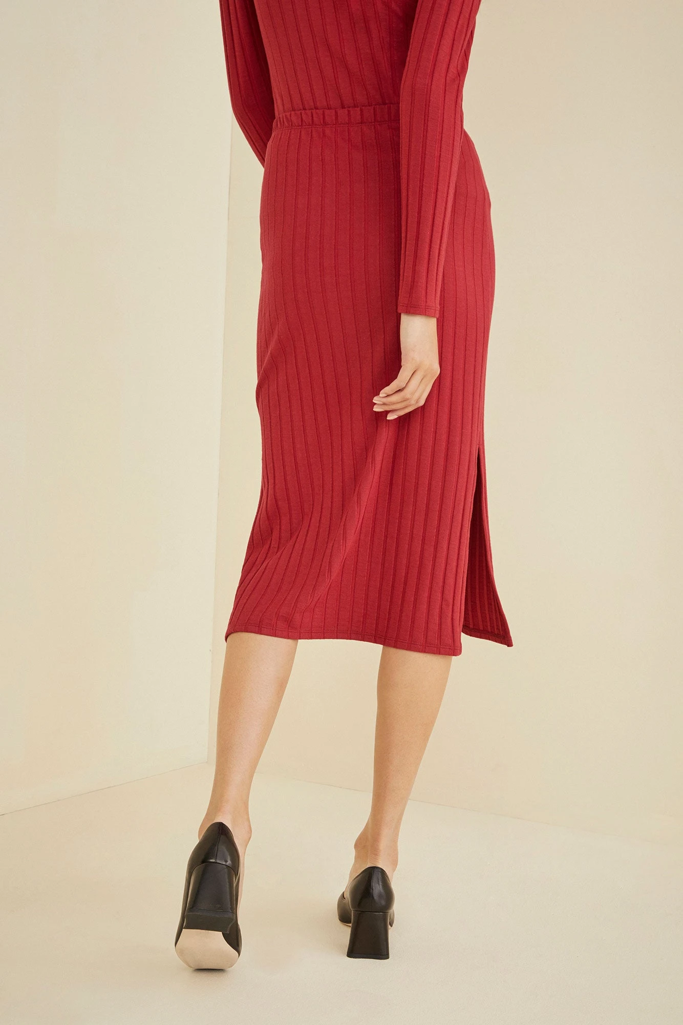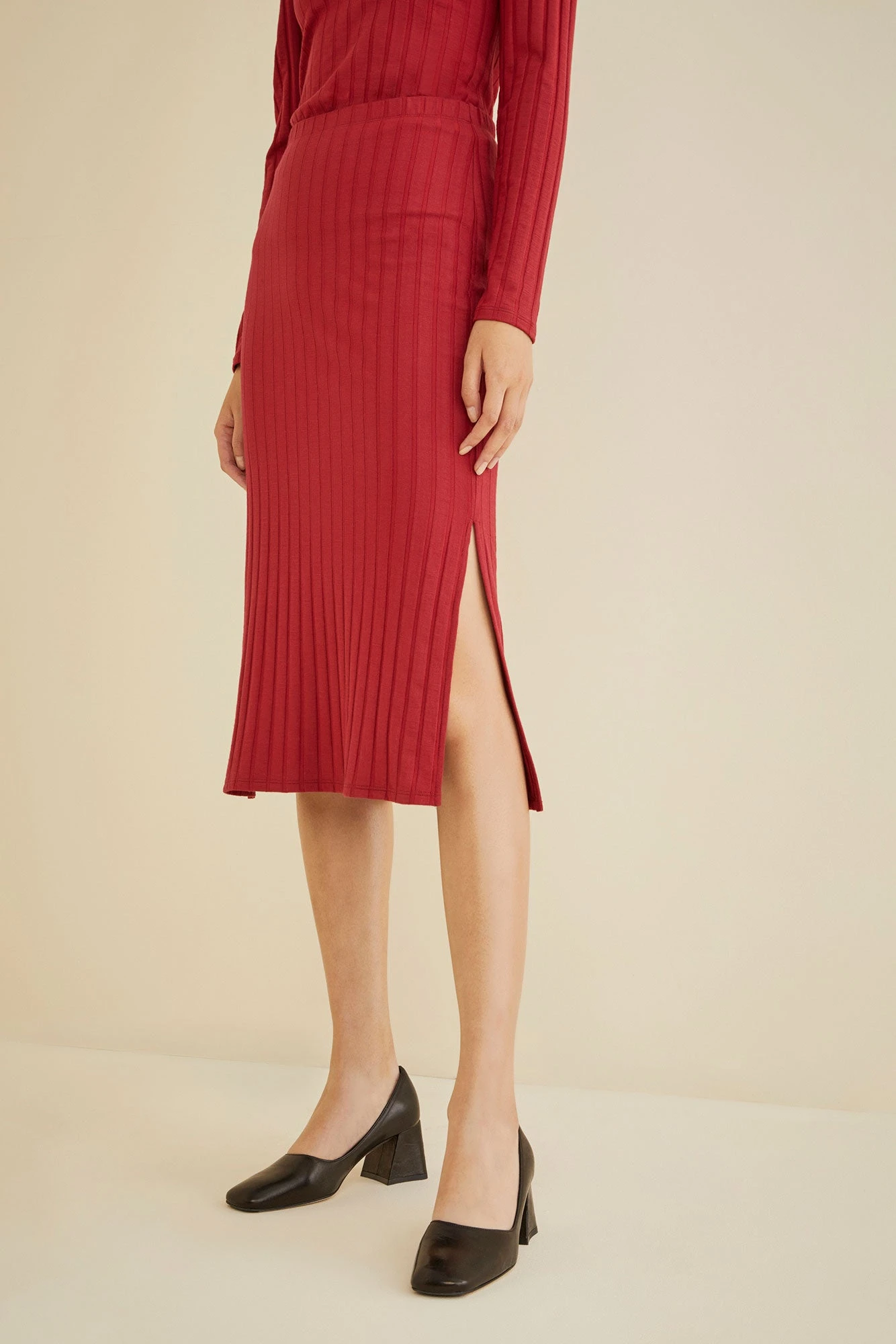 Ribbed pencil skirt with side slits that falls just below the knees. Made from our ribbed beechwood blend, this flattering silhouette can be dressed up or down with ease.