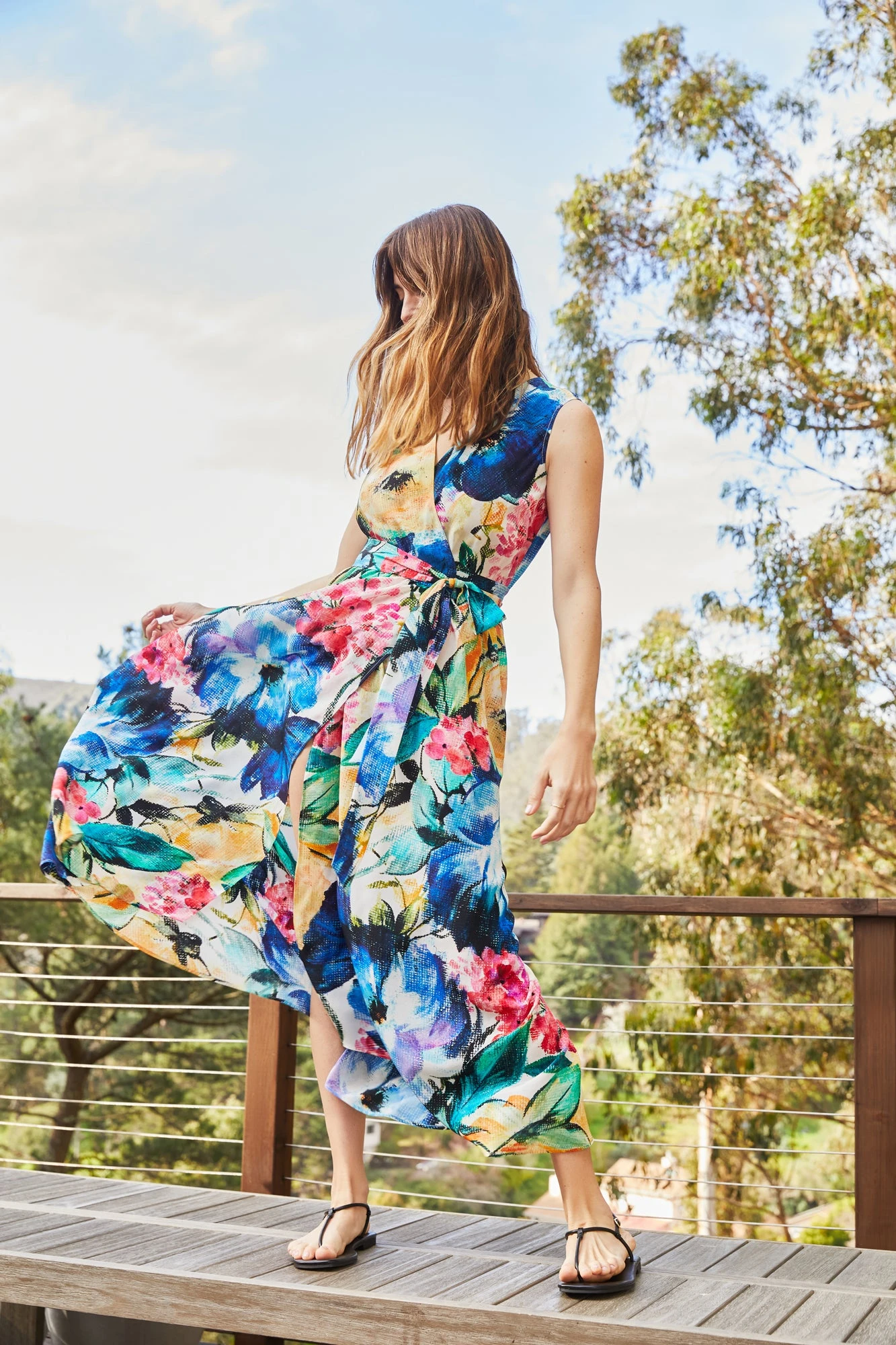 Sleeveless maxi wrap dress with a v-neck, self-tie at the waist, and flowing drape. Made from our luxurious Mulberry silk, the perfect fabric for occasion dressing.