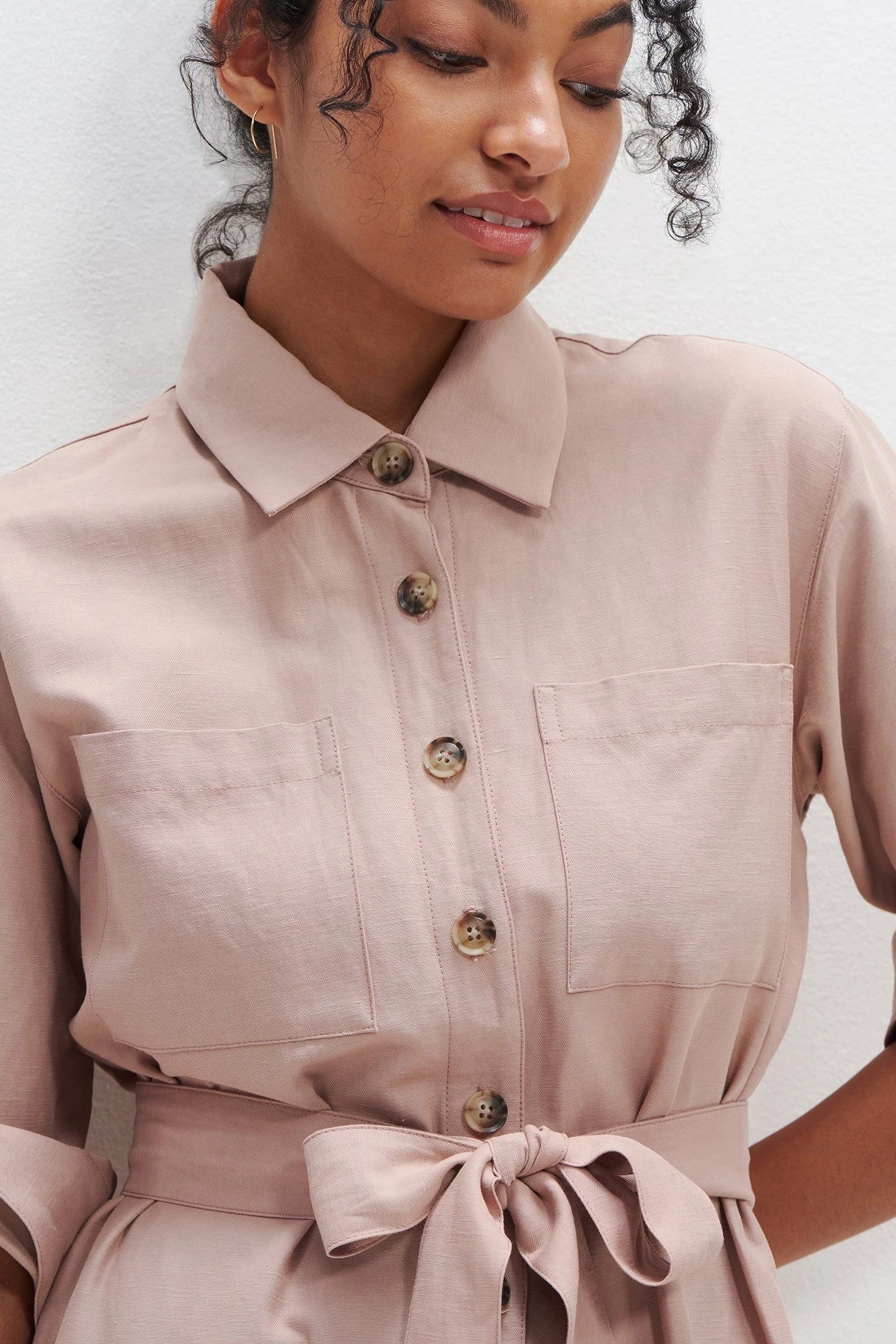 Long sleeve utility-style jumpsuit with large patch pockets, buttons down the center front, and a removable waist tie. Made in our lightweight yet durable blend of Organic Cotton, Lyocell, and Linen.