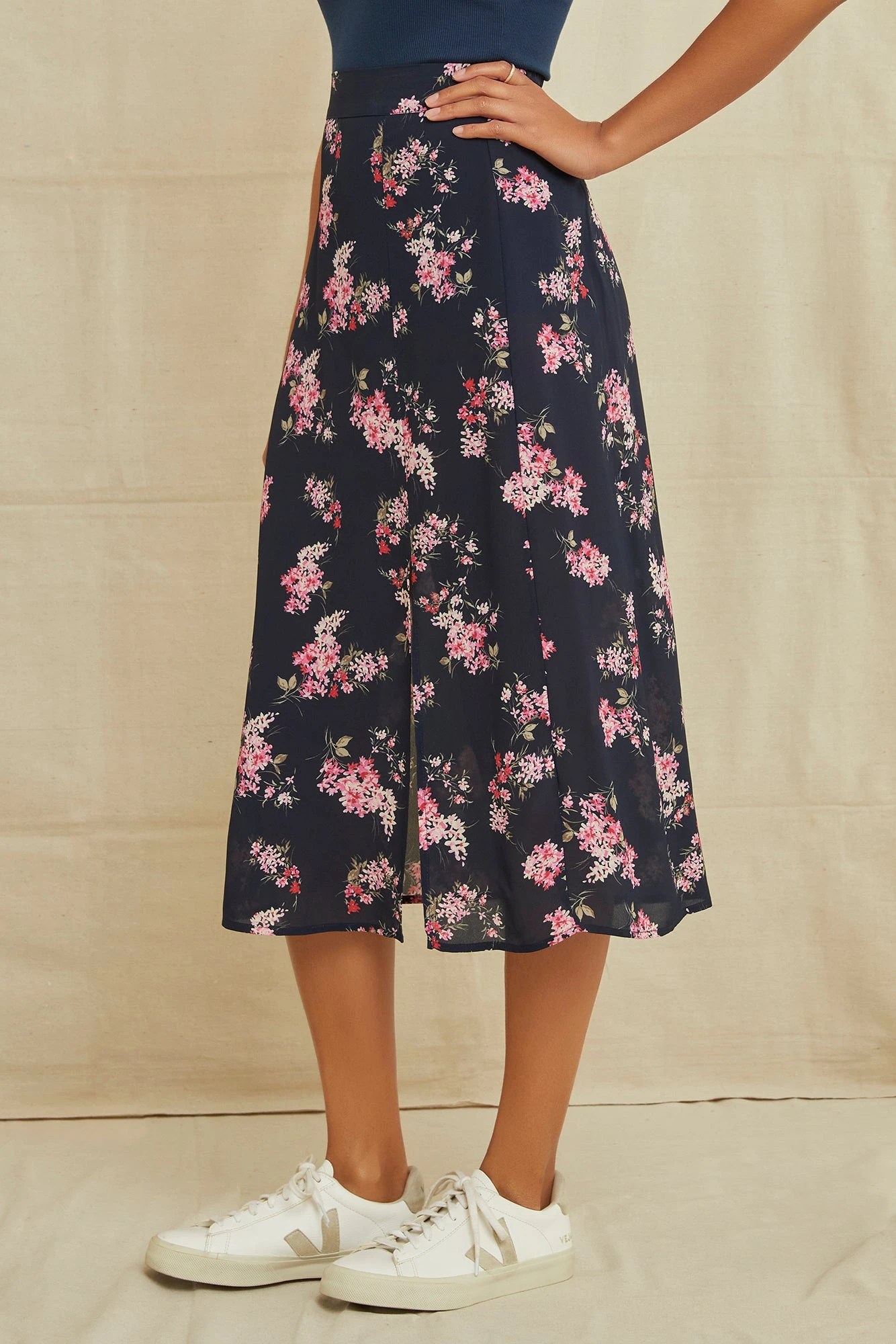 Midi skirt with a straight silhouette that falls below the knees, detailed with a dramatic side slit. The perfect office to off-hours piece, made from 100% Viscose.