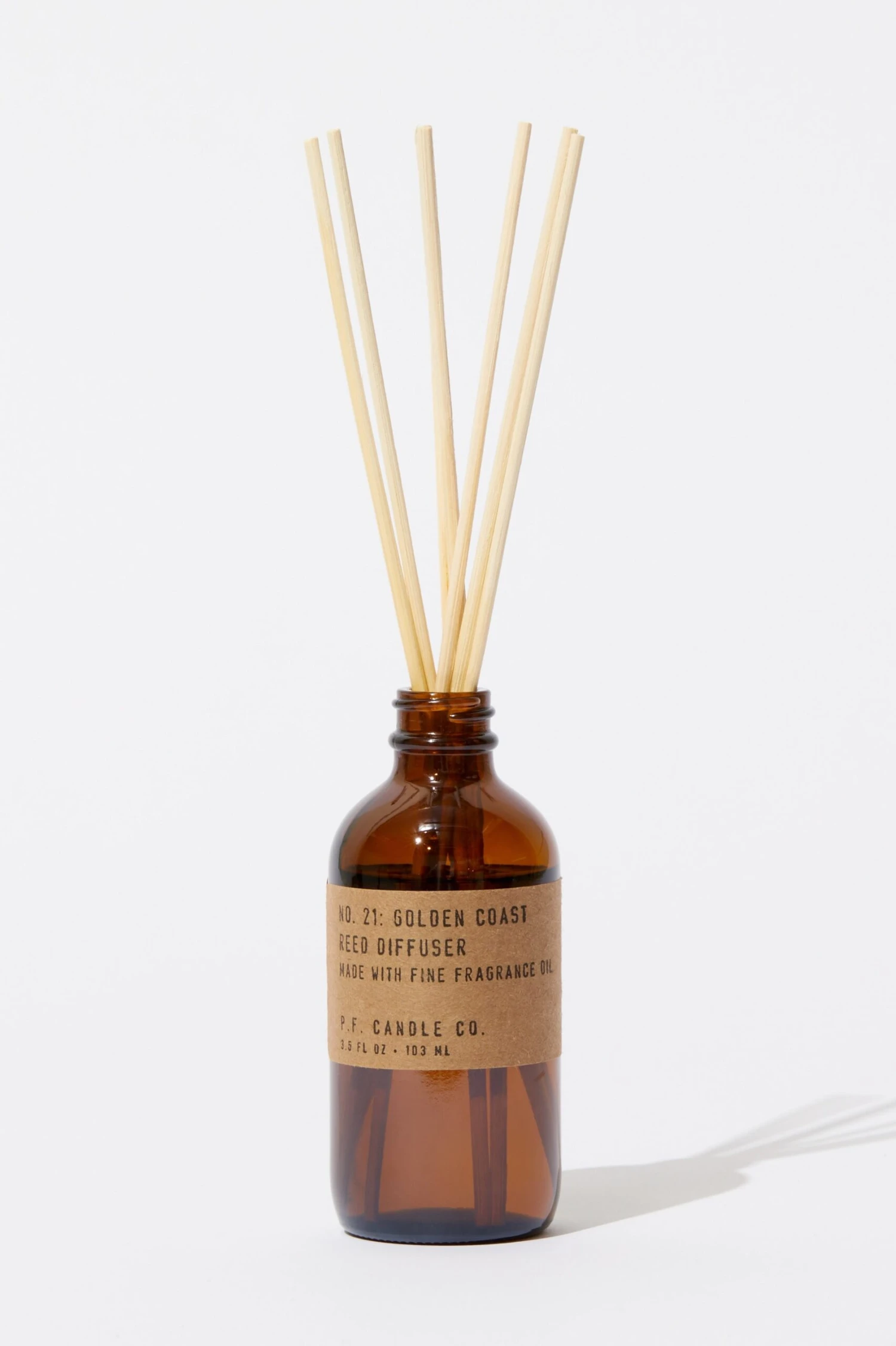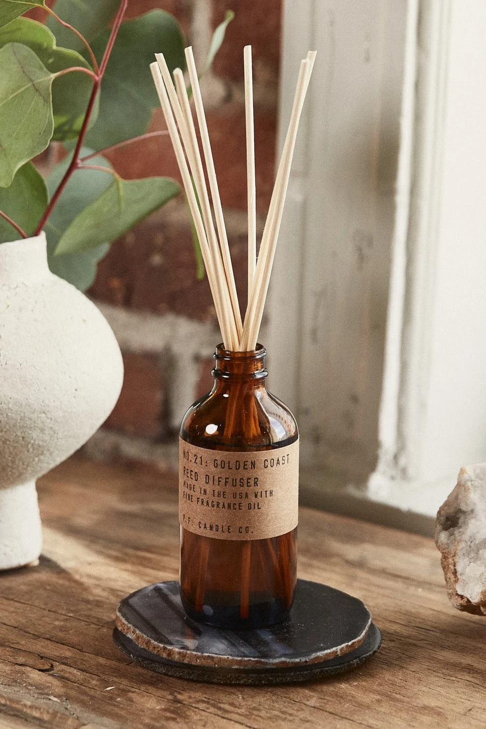 - The Reed Diffusers come in apothecary-inspired amber glass bottles with the P.F. Candle Co. signature kraft label and rattan reeds. Low-maintenance scent throw, all day long – no match necessary.