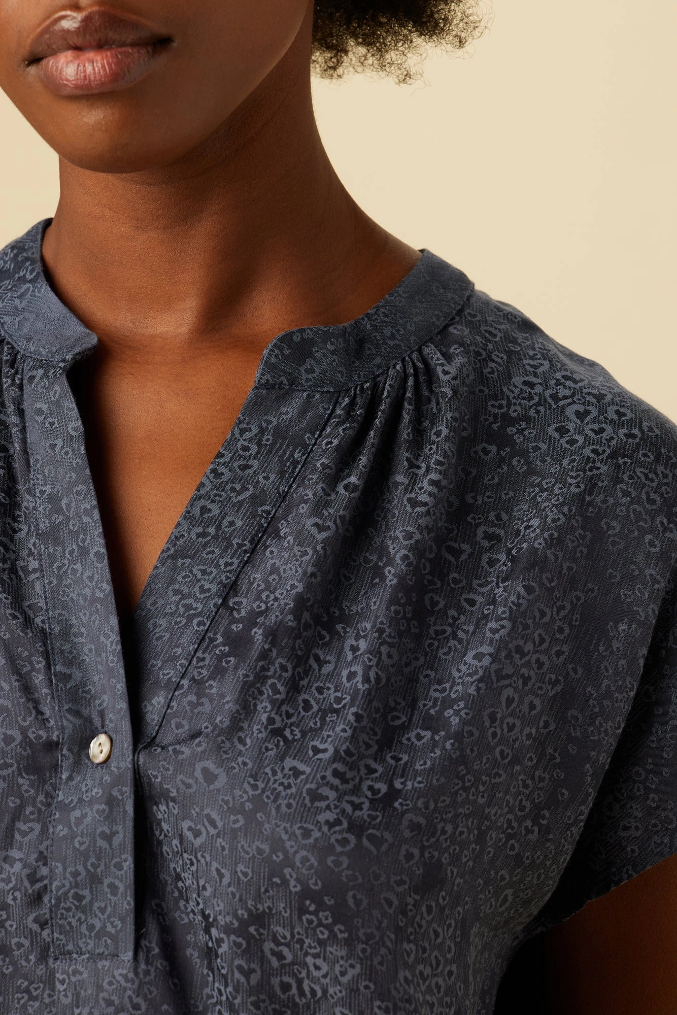 Renata is one of our best selling and most versatile styles, the epitome of effortless dressing. Featuring a v-neck opening with single-button closure, short sleeves, and a relaxed fit, now made in our Cupro Viscose Jacquard.