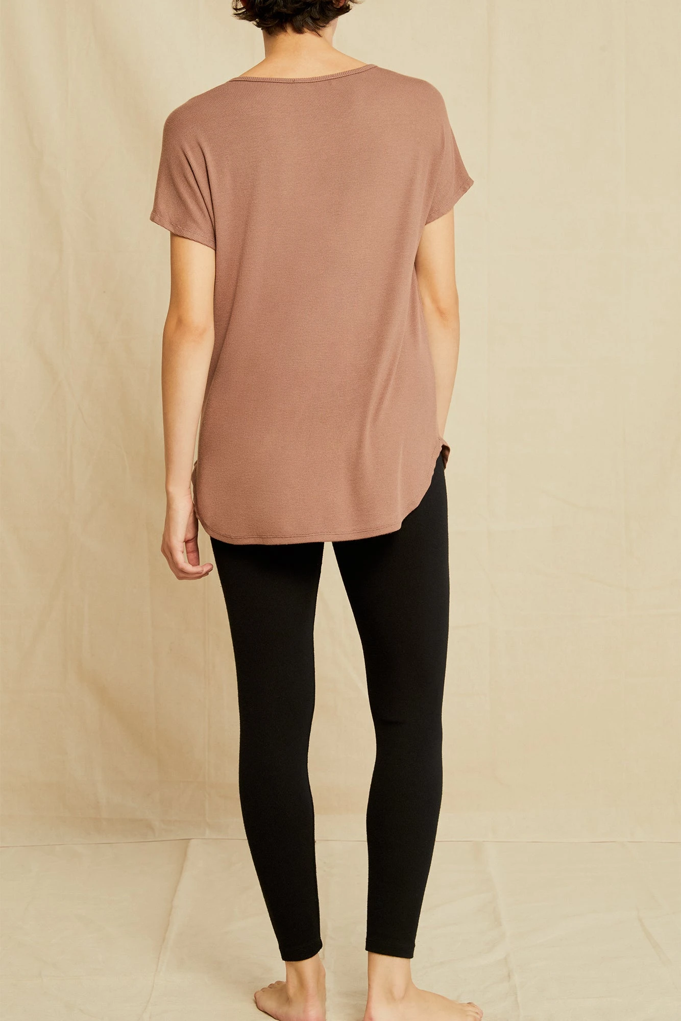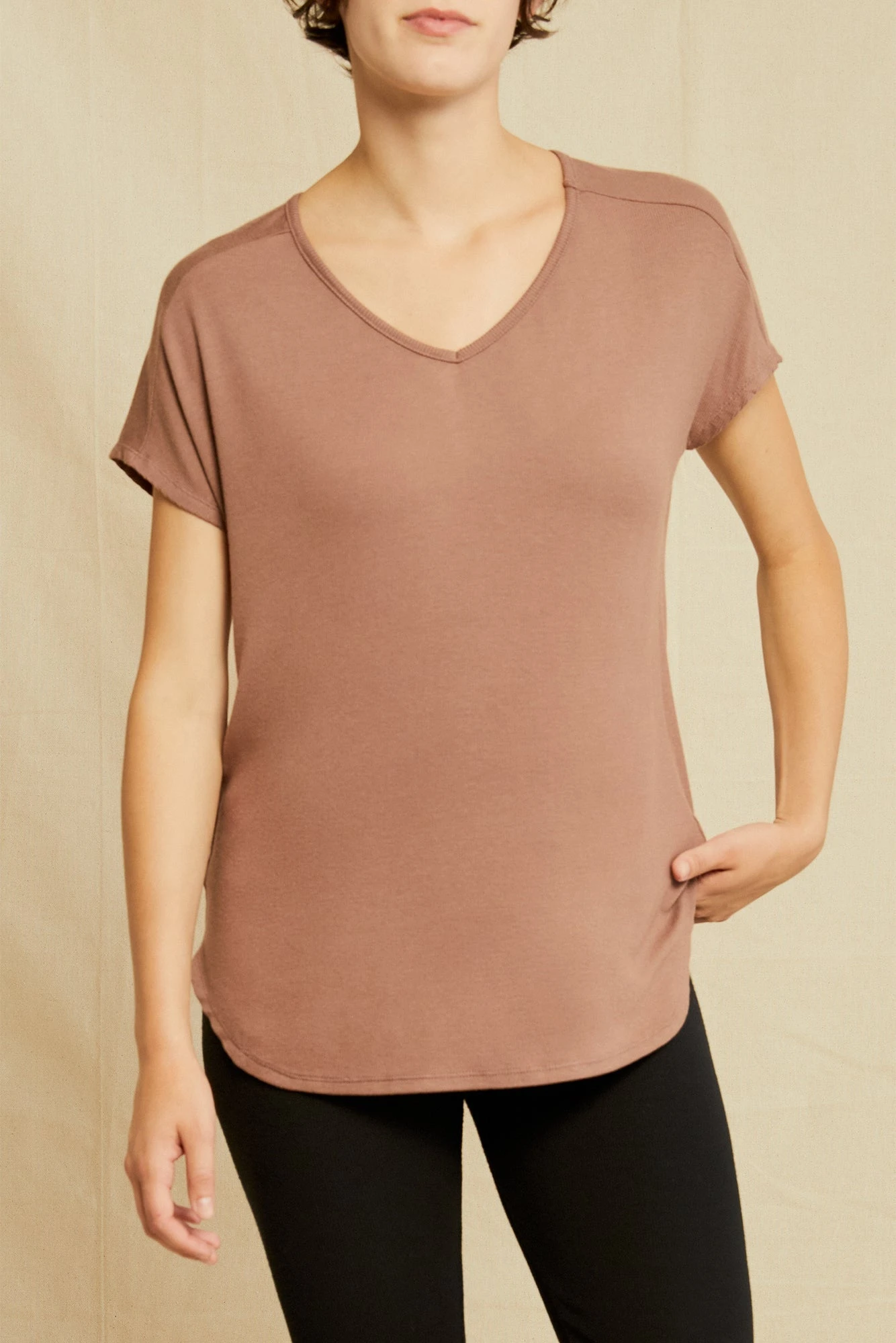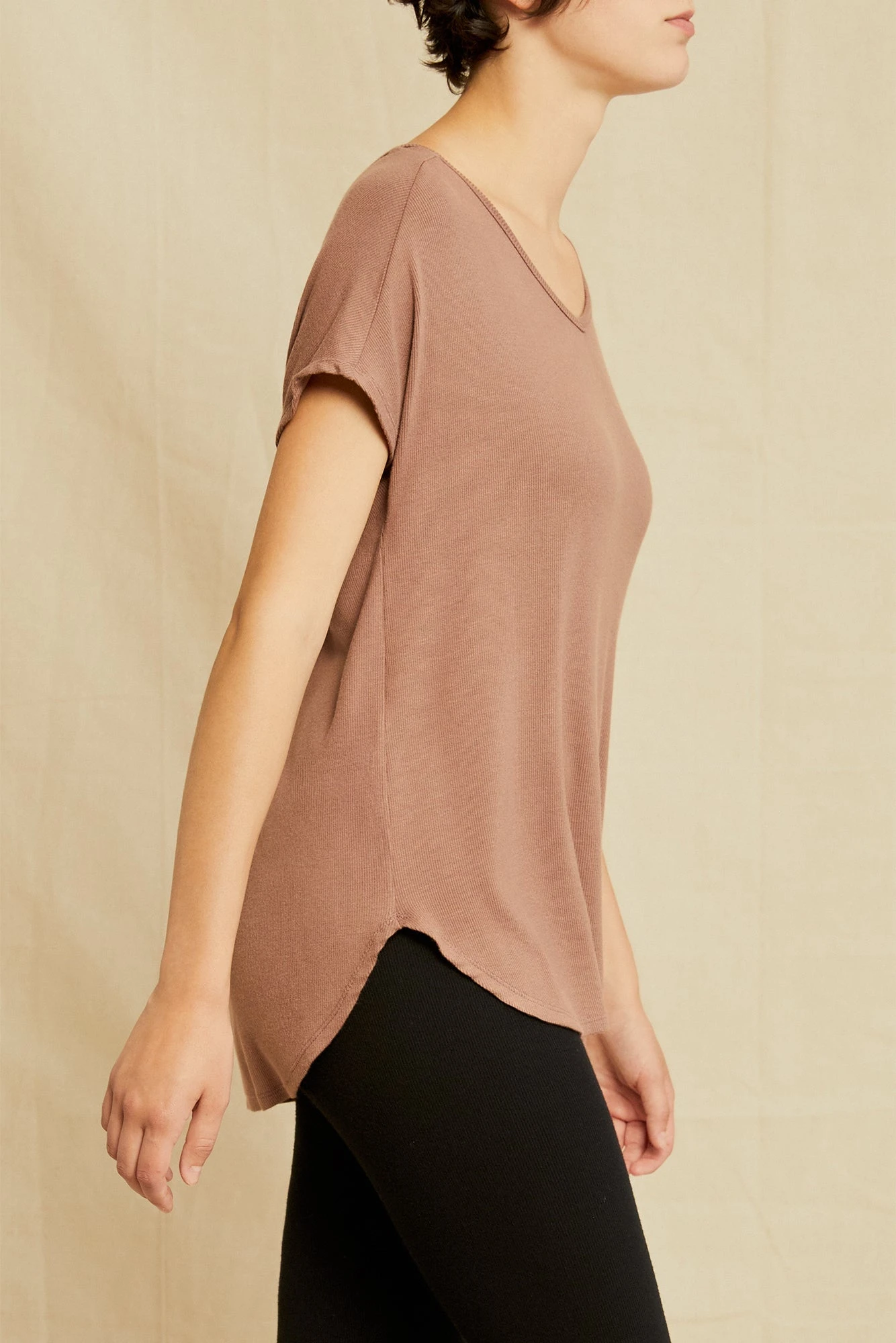 Relaxed fit v-neck tee with short sleeves and a shirttail hemline. Made in our silky-smooth Dream Rib, a sustainable blend of beechwood tree fibers.